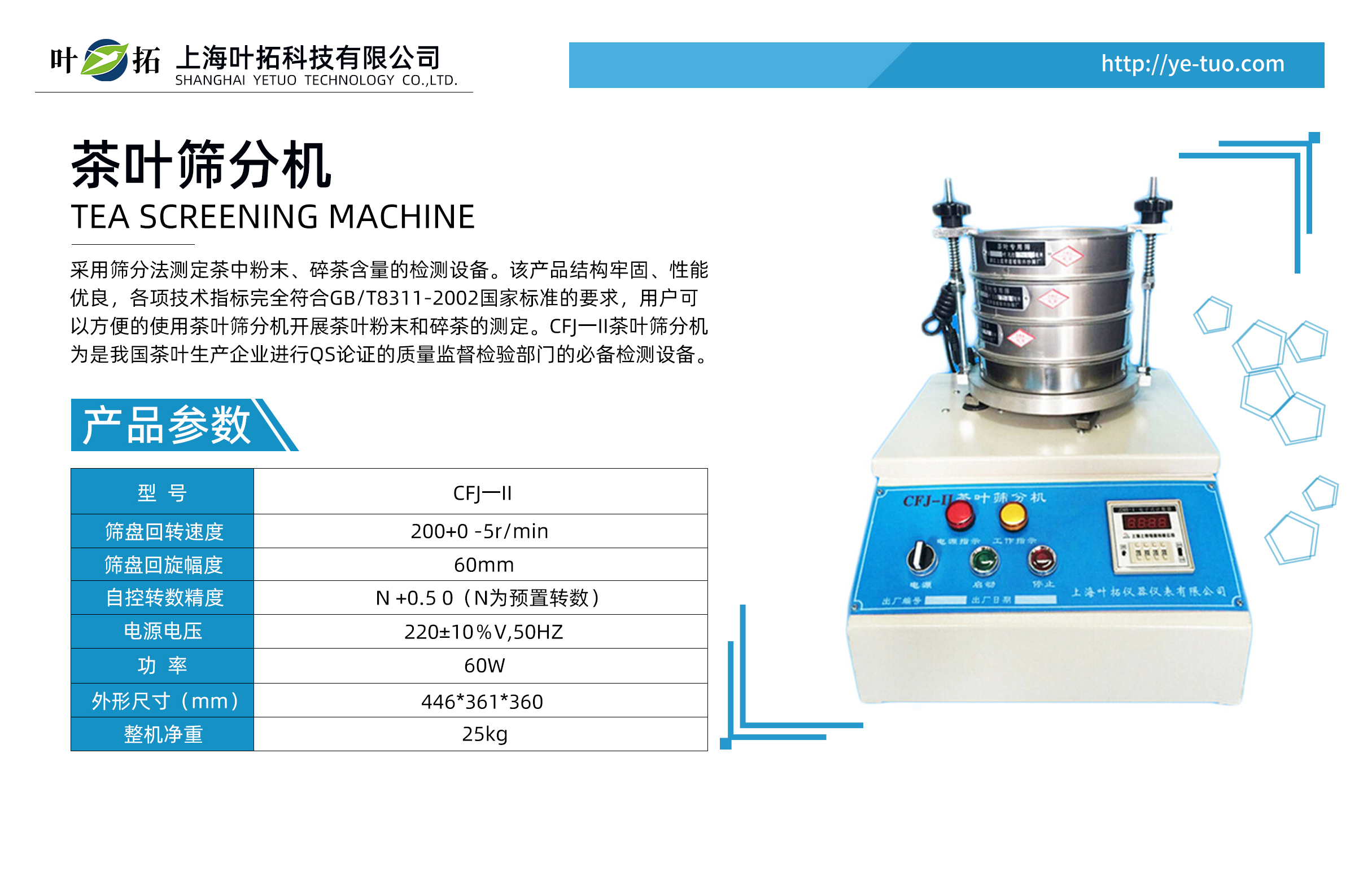 采用篩分法測定茶中粉末、碎茶含量的檢測設備。該產品結構牢固、性能優良,各項技術指標完全符合GB/T8311-2002國家標準的要求,用戶可以方便的使用茶葉篩分機開展茶葉粉末和碎茶的測定。CFJ一II茶葉篩分機為是我國茶葉生產企業進行QS論證的質量監督檢驗部門的必備檢測設備。